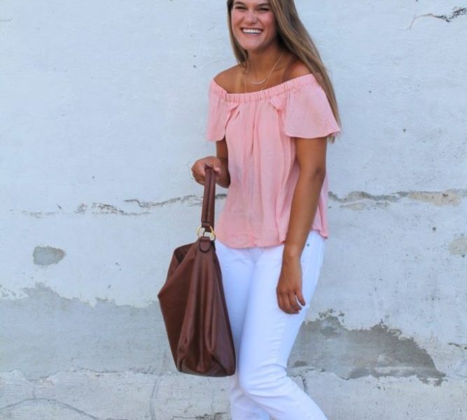 This Fashionista is rocking this affordable off-the-shoulder pink top from Charlotte Russe. She decided to pair them with white pants to really make the top pop! The brown sandals and purse are not to harsh against the delicate colors. Lastly, she decided to style the outfit with a gold necklace from Francessca’s. This outfit can be paired with a small gold necklace as well. Another option can be seen here.