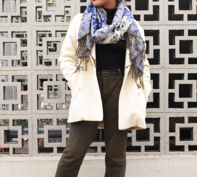 Describing her style as “grandma chic,” this Fashionista embodies the poise of a dignified, well-respected woman—I think of the Grand Duchess in Anastasia. One would never think that her luxurious coat by Herman Kay was only $5 at a small vintage store in Lawrenceville, Georgia. The pashmina scarf—a staple of any fashionable older woman—is draped effortlessly around her neck, the golden tassels float just above her coat buttons, inlaid with gold detailing.