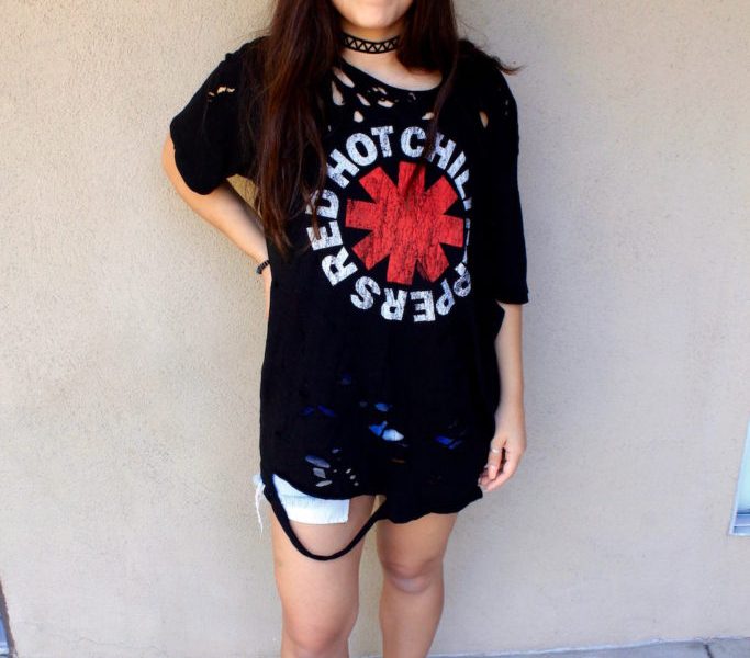 Not only can you dress up the T-shirt with accessories and other pieces of clothing, you can change up the actual T-shirt. I have also seen many fashion-forward celebrities like Kylie and Kendall Jenner wear distressed and bleached rock band T-shirts. That is what this grunge Fashionista was trying to accomplish. What she did was she found her favorite band, The Red Hot Chili Peppers, on a T-shirt and grabbed a pair of scissors and distressed it herself. She paired it with a caged choker and black and white high-top vans.