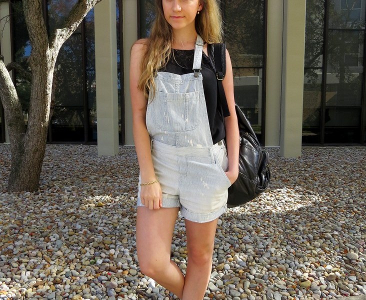 The pinstripe denim of her overalls is the perfect summer print for the first day of classes, and she keeps the color palette simple with pale blue, gold and black. She layers a high-neck black top underneath and is prepared for some serious note-taking with a glam black leather backpack. Overall (get it?), this look is a fresh play on an old classic and by adding cool metallic accents, it definitely transcends the vegetable patch.