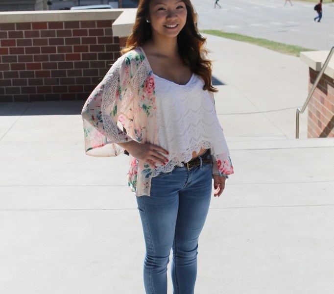 This Fashionista pairs it perfectly for the bipolar spring weather we’re currently experiencing here at UNL. She paired her lightweight, sheer kimono with a tank top to keep it cool when the temperatures spike in the afternoon. Her choice of jeans keeps her warm on the walk to chilly 8:00 a.m. classes.