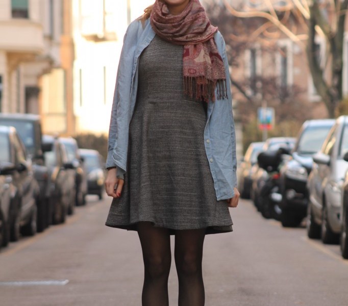 This Fashionista’s textured gray dress nicely complemented the neutral tones within her red scarf, but was even more contrasted by her open chambray shirt. One of the best items for layering, the chambray shirt adds an alternative color, texture and some necessary warmth. With the simple addition of a chambray shirt over a dress, the look is more casual and weather-appropriate, not to mention the major style it brings to the outfit.