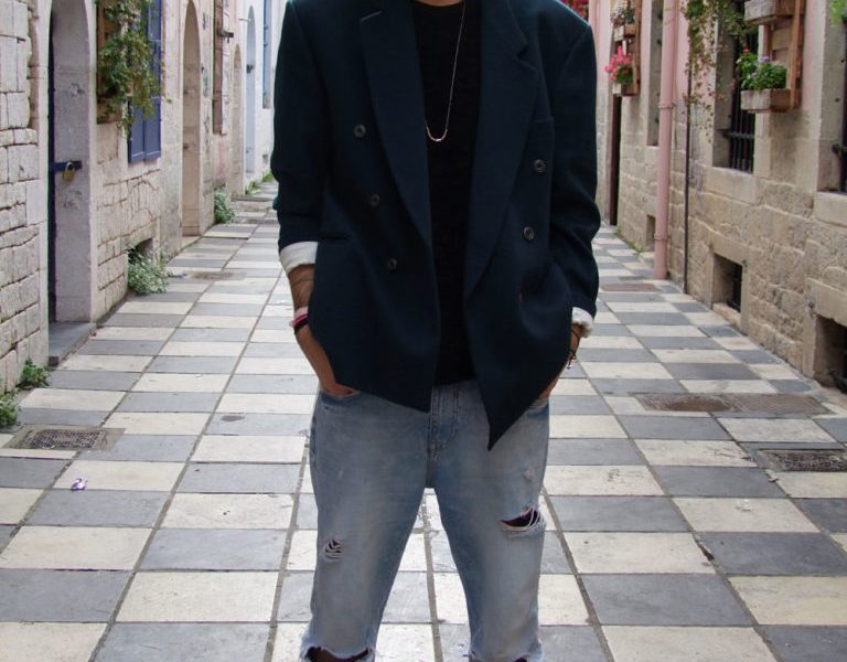 Spiro is all over the place from outfit to outfit and uses his clothing to express how he feels. Usually, he loves to wear jeans and feel comfy. Two things greatly affect his style: mood and affect. His mood inspires the outfit choices he makes daily but more importantly, he considers what affect he wants his outfit to have for the day, situation, or event. Then he goes on to dress accordingly. “Today’s outfit is the outfit I love to wear mostly when we have a photo-shoot—ripped baggy jeans, a black knitted blouse, this gorgeous jacket—a gift from Patricia Fields’s private collection, ankle boots and my favorite hat”.