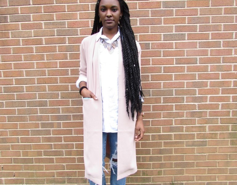 Get this Fashionista’s look with a long pastel jacket, a white button-down and some boyfriend jeans. Just don’t forget to amp up the look with some of your favorite accessories.