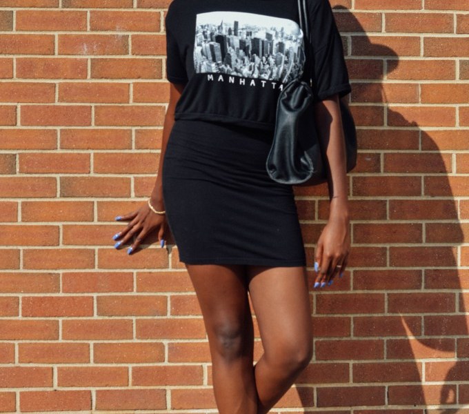 Continuing on with the ensemble, the Fashionista wore a black graphic print crop top. The long sleeves gave it more of a tomboyish look, adding on to the edgy presence of the outfit. As well, the Fashionista wore a black pencil skirt to insinuate her curves and model-esque body! We need to call America’s Next Top Model: College Edition ASAP! What makes this Fashionista’s look really stand has to be the flats that are rather a very light peach color. It highlights the entire outfit, and even makes these amazing strapped flats look gorgeous! To finish it all off, the Fashionista opted for a black leather bag. Leather bags are always essential, and she shows just why with her amazing dark and vampy outfit.