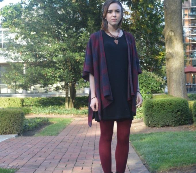 I found this Fashionista on one of the first chilly days of the season strolling around campus. She was rocking a T-shirt dress, which can easily be taken from your summer wardrobe and pushed right into the fall. You just need to throw on some tights and a sweater and you’re ready to take on the autumn temperatures. Her red tights give her look a little something extra rather than just the normal black or nude color. Her tights allow her to pull in the red from her shawl and her jacket.