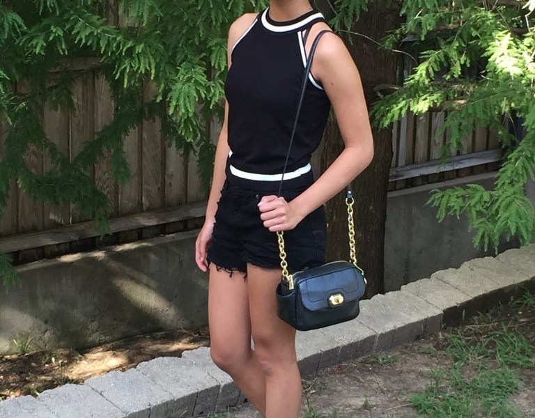 This Fashionista’s outfit is super simple but does the job when it comes to comfort and style. A black top like hers is a great choice because it’s breathable and comfortable with its halter top look. Her high-waisted shorts are basically a staple in any modern girls’ wardrobe because they’re so easy to style and to dress up or down. This Fashionista’s platform sandals pretty much make the outfit because she could have easily chosen a pair of chucks, but this detail makes her look a bit more put together. Of course, her Coach cross-body is perfect for summer because it’s out of the way and totally cute.