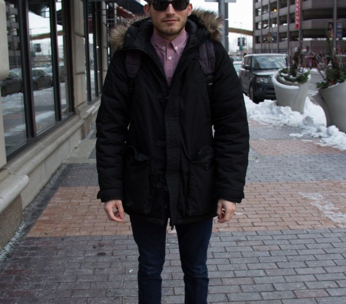 This Fashionisto pairs his fashion-forward gingham shirt with dark wash jeans and a more casual pair of lace-up Vans. He balances out the outfit perfectly, as not to look overdressed for the occasion. He stays warm with a puffy coat that he left slightly unzipped to show off his classy button-down. The coat features a fur hood that complements his outfit so well, and at last, he tops off his look with a few crucial accessories: a good Hershel backpack and some slick shades.