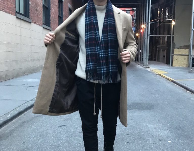 The Fashionisto pictured here is wearing a half turtleneck sweater from Topman with a camel fur overcoat from Club Monaco. These neutral shades allow him to pair these articles of clothing with black Fear of God ankle zip trousers and Clarks desert boots, adding a twist of street-wear to the sophisticated and sleek look. Finally, the iconic Burberry scarf and aviators add the finishing touches to the outfit, giving the Fashionisto the opportunity to express his particular tastes.