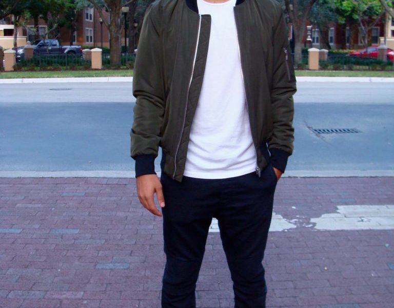 This cool guy is wearing a classic olive colored bomber jacket with a side zipper on the left arm. It’s paired with a bright white T-shirt and black moto jeans. What are moto jeans, you might ask? They are jeans with cross-stitches and patches usually found on the knee. These moto jeans have an applied elastic around the ankle to add detail. Moto jeans add style to any outfit with just a subtle touch. So, leave that plain denim at home and skip on the distressed pair with the rips because moto jeans will add a wow factor to any simple outfit.