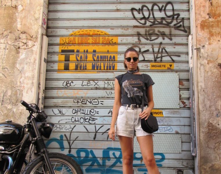 When walking down the streets of Rome last week, the city where I am studying abroad this semester, I couldn’t help but admire this Fashionista’s edgy yet feminine vintage-inspired outfit. She maintains an air of “cool” (more literally) as she dresses in a breezy T-shirt, high-waisted shorts and sandals while displaying an effortlessness in wearing season-fluid items. While the denim cut off shorts are clearly meant for warmer weather, the black T-shirt and matching accessories serve as perfect transitional pieces and their versatility is part of what makes this outfit so classically fashionable. Peruse the Internet or hit up your favorite thrift store this week for a vintage T-shirt that will serve as a new “staple” in your seasonal wardrobe.
