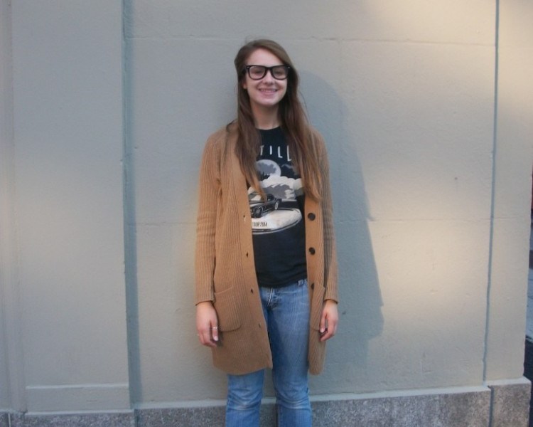 So how does one wear Dr. Martens? Our Fashionista’s look is one of the many different ways to style an outfit with them. She did so with a cool Bastille band T-shirt, blue jeans that are cuffed at the bottom and a long and warm brown cardigan that ties the look together. She adds simple diamond jewelry to bring in some bling.