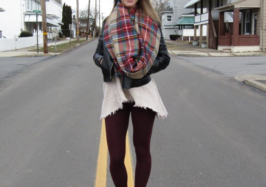 This Fashionista was rocking a tan fringed-bottom sweater paired with maroon leggings. She found the sweater at Marshall’s for under twenty dollars which is a steal! To add some detail and warmth to her look, she tied a plaid blanket scarf to create a makeshift infinity scarf. She paired her clothing with a pair of black ankle booties with gold accents. She added some extra warmth and detail with a pair of brown wool socks peeking out the top of her booties. To top off the look, she sported a black faux leather jacket from Forever 21 and some everyday string bracelets and a ring.