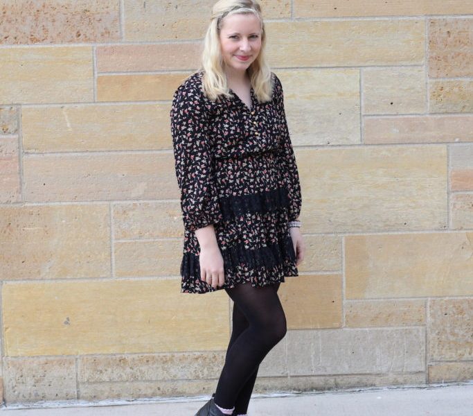 But, this Fashionista has got me rethinking my go-to essentials. I honestly cannot remember the last time I wore a dress or skirt. Those 8 a.m. classes usually do not equal a dress, especially not one as cute as this rose-printed frock with lace detailing. She chose a shoe with a minimal heel in order to keep it her look both casual and comfy. Instead of grabbing my knee-high boots, I am going to try donning lace-up booties with frilly socks for a bit of girly detail which adds balance to the toughness of the boots.