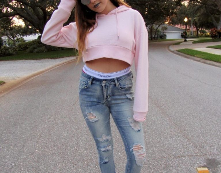 This outfit really exemplified how you can turn simple pieces into a trendy look for any occasion. It also was a wonderful reminder for me to get back into the thrifting game! This is a look that can be easily recreated after just one visit to a thrift store. The baby pink cropped hoodie and flirty glimpse of the CK underwear add a feminine feel to an otherwise tomboy-ish outfit. Her Adidas Superstars and socks demonstrate a very grunge color-blocking technique that has been seen in current runway trends. She finishes off the look with a Converse hat, circle-rimmed sunglasses, silver hoop earrings and a matte gray lipstick. All three accessories are super unique and to the area and made her stand out even more.