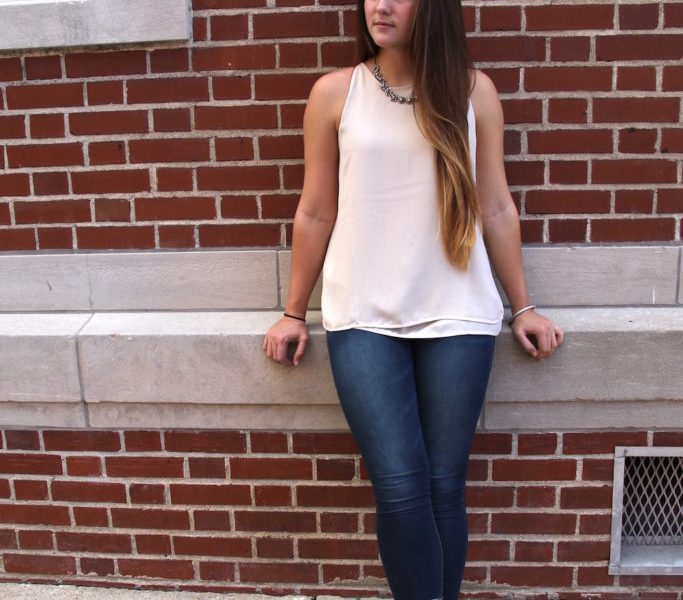 This Fashionista knows that you don’t necessarily have to go overboard to look great. Most times a clean, simple outfit can be even more striking than a look layered with accessories and overdone makeup. You don’t have to sacrifice comfort for fashion, which is why this outfit features a flowy top and some comfortable jeans that look good and feel good too! Even her accessories are toned down with a simple necklace and bracelet that add just enough shine to brighten up the outfit. Pair this look with modestly heeled booties and you have a look that’s comfortable enough to trudge across campus in, but cute enough to snap an Insta on your way!