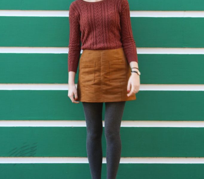 I have always admired her prevailing unique, yet classy, style. She is able to pair together items that make for an incredibly versatile ensemble. In this outfit, she demonstrates this perfectly. Donning a maroon sweater from American Eagle Outfitters, she pairs it perfectly with a brown suede skirt from JCPenney. Along with gray tights and lace-up wedges, she ties her ensemble together with a simple black choker from a local boutique in our hometown.