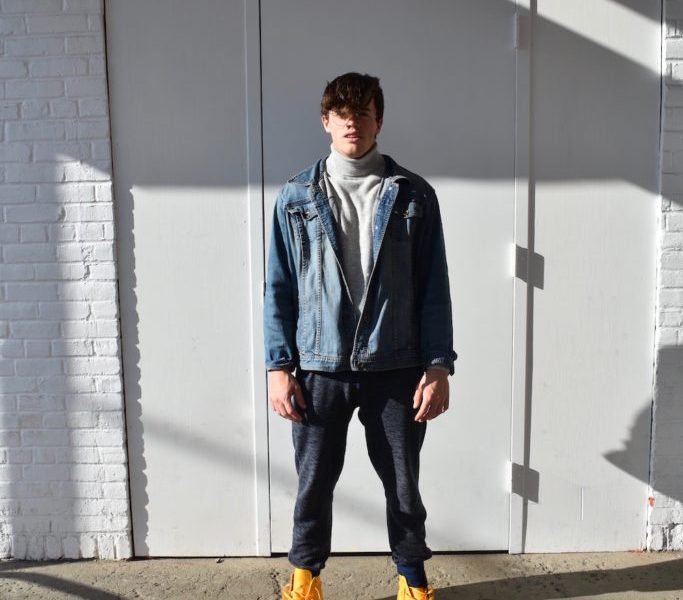 This Fashionisto wears a pair of navy joggers and a gray turtle neck sweater, with a denim jacket. Perfect for mood swing weather. As for accessories, he’s wearing round Ray-Bans glasses and vibrant yellow Converse sneakers (obsessed). In other words, the shoes do all the talking. A pop of color is what completes this look. These Converse are life and I highly recommend getting a pair of colored sneakers for the spring to throw on with a monochromatic outfit. What inspired this look were street style looks from men’s fashion week in London. Some trends I’ve seen are pops of athleisure (track pants, and track jackets), tailored suits and coats, and outfits with multiple textures.
