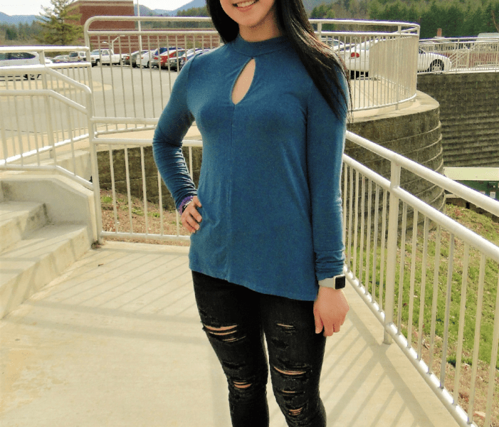 Her top has a high neckline and a chest cut out which gives her upper body more dimension and structure. As for her bottoms, she is rocking #RAD ripped black jeans which gives her an edgy look which is great for the in between winter and spring weather. As for the Fashionista’s shoes, she is strutting the mountainous scenery with clean, black, laced-up wedges.