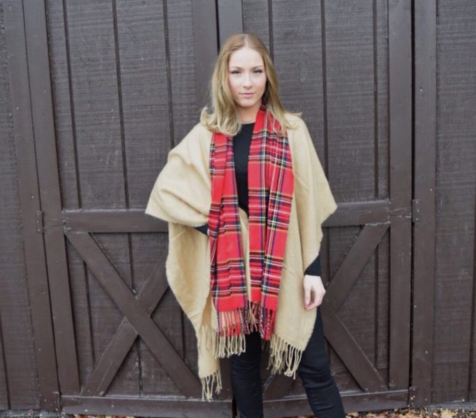 In this look, she takes a simple, black, long sleeve T-shirt and layers it with a thick beige poncho cape and a beautiful plaid scarf. The poncho and scarf combination adds a warm yet fashionable aspect to the look. From the waist down, she keeps it simple with black jeggings and some adorable light brown booties with a small heel. The booties ensure warmth and comfort when walking across campus.
