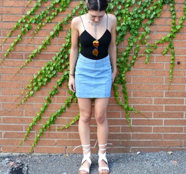 My sandals wrap up around my ankle, which is a very popular trend this season, and are from Charlotte Russe. My choker is from Earth Bound; this store is amazing if you love handmade treasures and a very earthy bohemian look. My top is from Forever 21 and goes great with almost anything because of its simplicity. The jean skirt is also from Forever 21 and was a great find! Ladies, jean skirts are totally in and making their way up on the trending list so be sure to go out and get one soon. They go with absolutely anything and you can dress them up or down! To top off the look, I accessorized my outfit with my favorite pair of reflective sunglasses from a local boutique and silver rings.