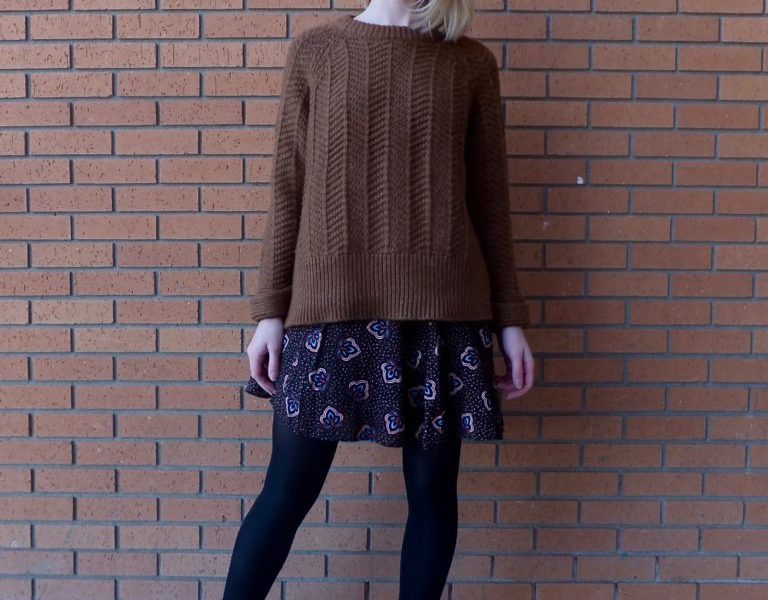 The outfit I’m wearing here may appear to be wishful thinking for a Canadian winter, but I refuse to give up on summer dresses simply because there’s snow on the ground. I like to adapt my personal style to fit the seasons by using pieces like this caramel knit sweater to layer up and bring the warmth to light weight dresses. By opting for a cropped cut, I’m able to show off the skirt’s pattern. With this outfit, my staple black faux-suede booties offer a bold contrast to the flared feminine dress. I enjoy mixing different types of pieces together—a floaty dress, thick sweater, black heels—until I find a combination that feels like “me.”