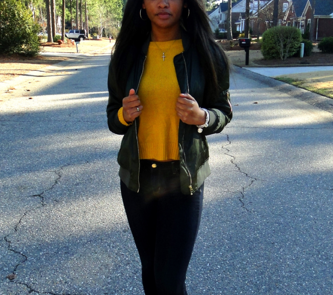Here is an example: For this outfit, I am wearing dark-washed jeans and a mustard yellow knit sweater along with accessories from Alex and Ani and Pandora. With approaching the chilly days of fall, I decided to throw on a satin green bomber, which tied the look together!