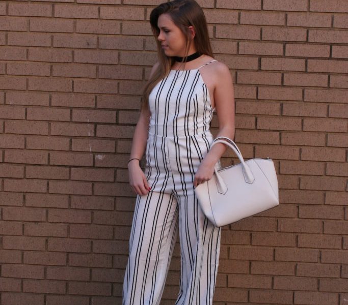 For this look, I was inspired by the classic colors of black and white. They go with anything and can be worn by anyone! I found the jumpsuit at a thrift shop called Buffalo Exchange for $15! It was such a great deal. The open back and high neckline give it such an edgy look that I love. I accessorized this with a thick black choker and white handbag, which has black detailing to perfectly match the jumpsuit. For shoes, I went with a classic pointed toe black bootie! Heels can really help when wearing a jumpsuit because it accentuates the leg, especially for a short girl like me!