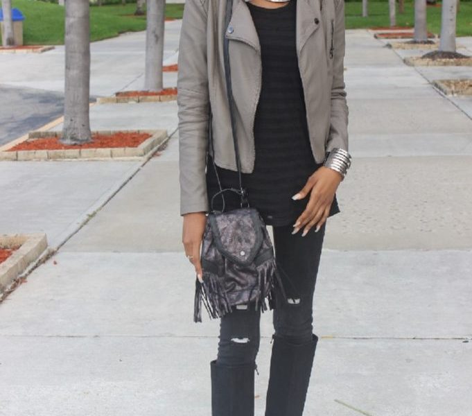 I was scrambling to find something in my closet that can actually keep me warm when I remembered my motto: when in doubt, black it out! However, I decided to throw on this taupe motorcycle jacket over my BCBGMAXAZRIA tunic. The metallic effect of my fringe cross-body bag reminded me to add my silver choker and cuff for some extra edge.