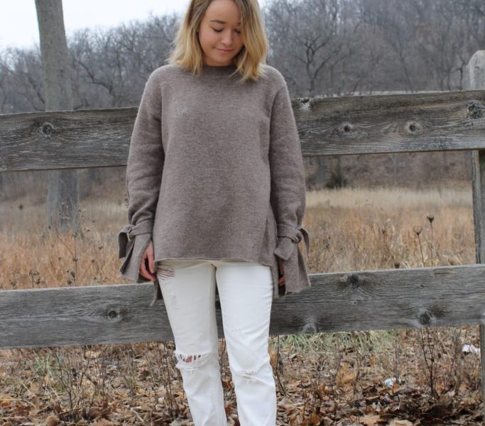 For this look, I stuck to my bohemian inspired basics. I’ve recently been obsessed with white, tan, and brown combinations, so I decided to pair my favorite pair of white boyfriend jeans with a light brown wrap sweater. Because of my petit structure, I added a little height with these distressed, tan booties, creating a super simple outfit with fun details that is perfect for any casual occasion!