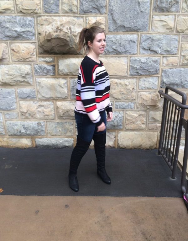 My striped sweater is one of my favorite pieces. it makes me feel like my Mom is hugging me even though she is five hours away. Over the knee boots are very trendy right now. So of course I have a pair and usually wear them with jeans or tights. As I said before, I enjoy sparkly things. Therefore, my earrings give my outfit that kick it needs.
