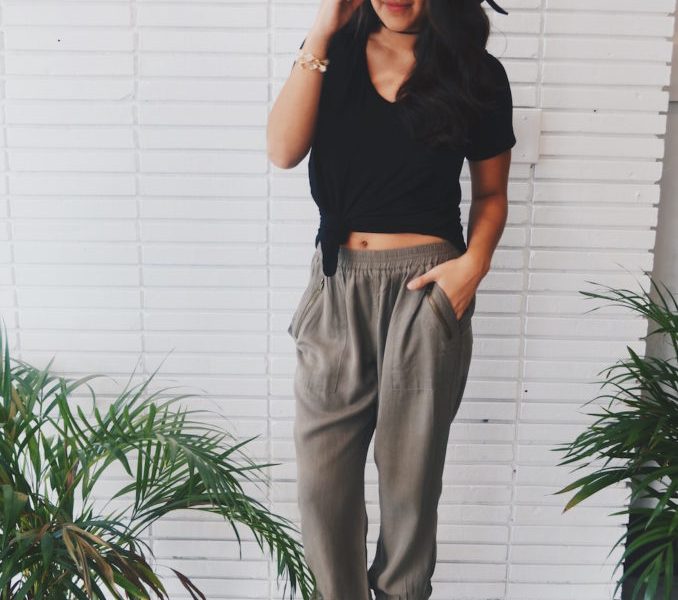 The photos featured in this post show me wearing a simple black v-neck, olive joggers, black suede wedge booties and a black choker. I also grabbed a felt floppy hat and a pair of cat eye sunnies to go with the look. Some of the pieces that I’m sporting give a little sneak peak at what our fall trends will look like this year, and boy am I pumped. Stay tuned ladies, as new posts will be hitting the blog on the first of each month. Good luck as we jump into another fabulous semester!