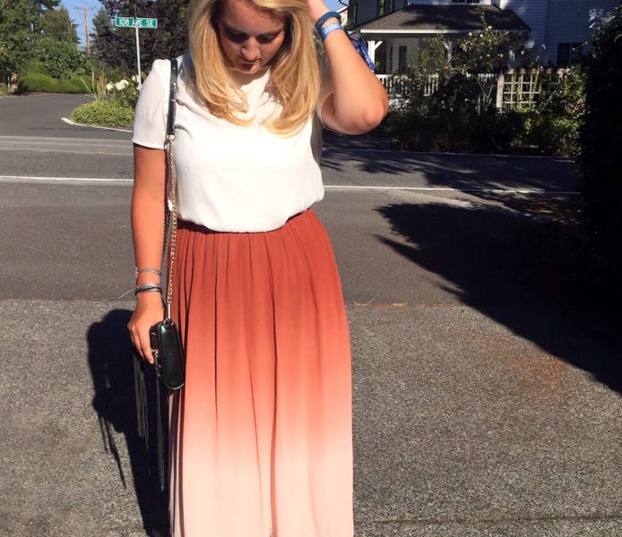 Since most of my outfits this semester will fall in the darker color schemes, I decided to share one of my more colorful outfits for my first post, with a skirt that I fell in love with the moment I saw it. Featured is the bag that has been my go to all summer, because of the amazing and unique metallic green color of it and the fun fringe accents. Seattle has currently been going through a rare heat wave, so this light airy skirt paired with the silky white shirt allow me to go outside without slowly melting away. The way the ombre colors of the skirt perfectly melt together embodies why I think of fashion as my favorite art form.
