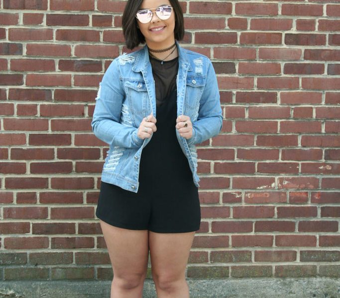 As for this specific ensemble, I chose to wear a mesh T-shirt underneath a romper with an open back. I accompanied the romper with my favorite torn jean jacket, black booties and a pair of pink sassy sunglasses. I believe that this outfit really captures my personality. The black romper is simple and sophisticated. Plus, it is paired with a fun and flirty mesh T-shirt and torn jacket that adds a little charisma. It perfectly captures my serious and edgy side, as well as my playful and whimsical side. My favorite part about a piece of clothing is the way it helps you to express yourself. With that being said, I cannot wait to keep expressing myself through pictures and articles on my journey with CollegeFashionista!