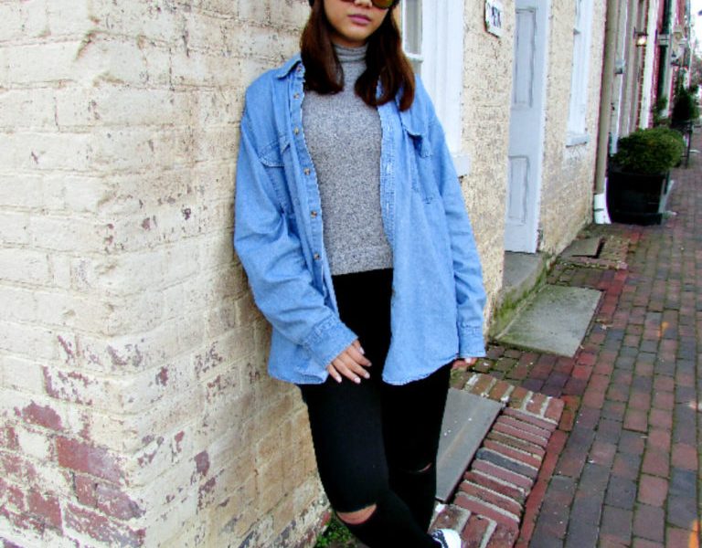 Lately I’ve really been into sporting turtlenecks. For this look, I edged up this soft grey turtleneck with black ripped-knee jeans. I purchased my oversized denim shirt from my local thrift store. Since it’s finally starting to get chilly, for more warmth I added a cute knit beanie. I wanted this outfit to be stylish, but also comfy when walking around in, so I paired this look with my trusty Superstar Adidas. Last but not least, I put on my mirrored sunglasses from Forever 21 to add a cooler aesthetic to my outfit.