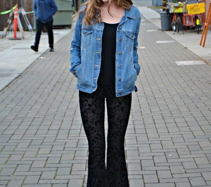 Luckily, I was able to find affordable trendy pieces such as these velvet bell-bottoms. They’re so comfortable and I got them on sale for only ten dollars at Forever 21! I decided to pair it with a plain black tank top so that the outfit wasn’t too busy and gave it a ’90s flair with a light pink & sparkly choker and a jean jacket. I suggest pairing velvet pants with an embroidered floral jacket, or plain black leather jacket. Velvet, flares, jean jackets, and chokers—it’s like the ’90s and the ’70s birthed a modern hippie lovechild.