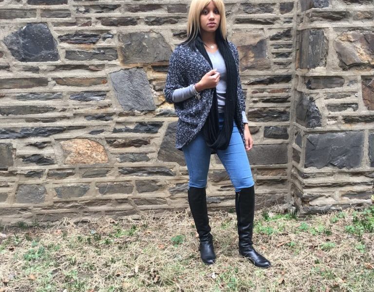 In these photos, I am rocking a neutral color palette. I have on a gray long sleeve fitted shirt paired with fitted skinny leg jeans, a black and white quarter sleeve cardigan, black infinity scarf, and a pair of black leather boots. I kept my accessories minimal with a couple of Alex and Ani bracelets and a simple silver heart Tiffany’s necklace that I wear every day.