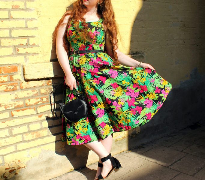 The outfit I’m wearing in this post is a mix of thrifted and new. The star of the outfit is this ’50s style floral sundress I found at a second hand shop in Savannah. To draw attention to my waist, I used a simple,skinny black belt. Everyone knows accessories make the outfit, so I accessorized the dress with some colorful earrings and simple gold jewelry. I love to add a bit of whimsy to my outfits, so I decided to carry my essentials in a little black cat bag. To ground my outfit, I wore a pair of simple, black sandals with a low heel for all day wear.