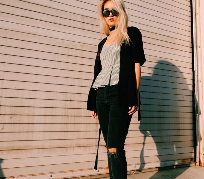 While I’m writing this, it’s summertime in New York. I love summer, because you can do a lots of thing when it’s summer in New York. Today the weather was quite nice. It’s sunny but breezy. So, I went out with my friends to have some cocktails at a rooftop bar. I picked a houndstooth bandeau top with peplum, then matched it with black ripped skinny jeans from ASOS, also layered it with kimono-style satin coat from & Other Stories. I accessorized this look by wearing a black velvet choker that I made by myself, and my favorite shades from Gentle Monster. Finally, I finished the look by wearing black belt-styled flats from Zara.