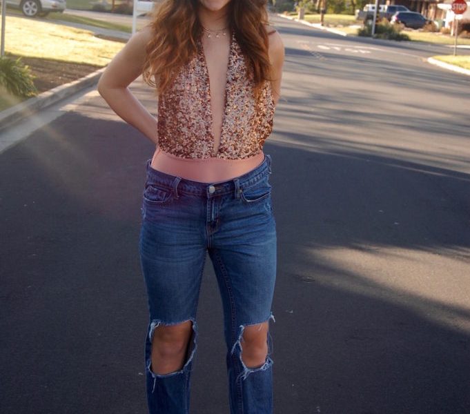 My favorite item I am wearing is my sequin bodysuit from Urban Outfitters. I love any type of bodysuit, but the brighter the better. This bodysuit is perfect for a party or even every day when paired with a sheer top or any deep v-neck T-shirt. The last part of my outfit was my star choker. I have seen star chokers everywhere as it is very seasonal but also very cute! Chokers are worn by everybody and everyone; adding some shapes and charms to your chokers makes your style pop.