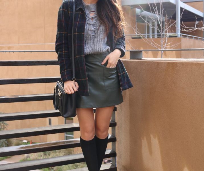 For my first outfit, I decided to share with you a look that I like to call Connie. Why you may ask? It’s because this outfit screams my personality. I don’t know about you, but I don’t like wearing pants. So what do you do? You wear a pleather mini skirt from Forever 21 with knee-high socks of course! This is a trick I’ve been doing during the “cold” days at Riverside. I paired this duo with a grey knit sweater and a men’s Ralph Lauren, plaid jacket that I took from my grandpa. Don’t be afraid to wear men pieces because fashion has no boundaries! I know it’s almost impossible to ignore, so let’s talk about those glitter boots. Glitter is my favorite color and don’t try to tell me otherwise. Having a statement piece like these boots can really help your personality shine through your outfit. Finally, I decided to accessorize with this simple, black crossbody purse and there you have it!