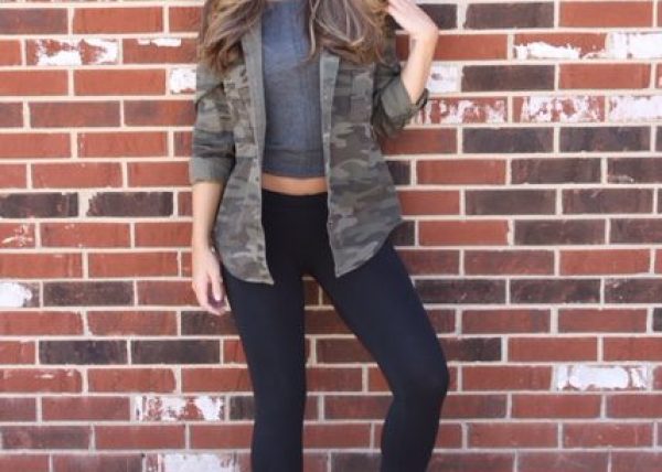 My style now is pretty much all over the place and varies day by day. Some days I am feeling sporty and want to wear cute leggings and a workout tank. Other days you can find me in a pretty romper with fun, strappy sandals and an oversized purse. This outfit is inspired by my love for leggings. Leggings can go with pretty much everything and with back to school styles, I figured what better way to be stylish and comfortable on campus? The camouflage jacket is extremely versatile and can be taken off and on depending on the weather outside and in class. Underneath the jacket is a gray knit crop top paired with simple black leggings with black and gold sandals to give the look just a small pop of color. The outfit looks and feels great with or without the jacket and I think camouflage print is going to be back in style this fall. This outfit is perfect for a school day, brunch or even a date to the movies. Gold accessories will pair nicely with this outfit and it makes for a great fall look.