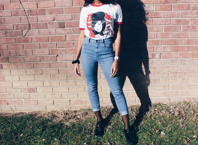 This outfit is super casual and combines some of my favorite pieces.It is the perfect outfit to wear to class, to grab a bite to eat, or run errands in the city.The shirt is very vintage looking. I love the cute graphic of Amy Winehouse, which was designed by my dad. The light wash, high-waisted jeans are a staple in my closet because they are so comfortable and can be paired with almost everything.Lastly, I needed a few pieces to spice up my simple look of a t-shirt and jeans.I’ve been obsessed with this new fishnet trend so I decided to throw some on under my jeans to pair nicely with my velvet PUMA creepers to add to the look.