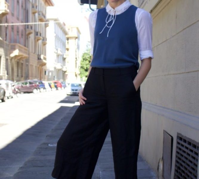 I’ve only just begun my semester abroad, but I am really looking forward to being able to bring you all some exciting styles from abroad. Now that the tourist season is in full swing, you have to travel a little outside of the city center to find the locals and their distinctive style. I tried to bring a little Italian chic into my outfit, but I’m far from understanding the full scope of the Italian fashion scene just yet. I’ve seen culottes on a number of different stylish woman, all equipped with unique shoes (most of which look precarious on the cobblestone streets). There is something uniquely old-school, yet simple about most of the looks that I’ve seen, as though the people are trying to blend in with all of the rustic charm of Florence’s winding streets. Because of this I chose a blouse with a high, tied collar and a knit vest in a cool modern color.