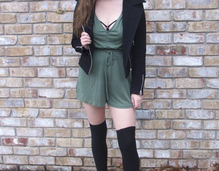 This outfit in particular is a typical look for me. Rompers are everything, and the possibility for wearing them is endless. I’ve been gravitating towards olive green as my go-to neutral this season. A little style advice? Never be afraid to pair low cut pieces with simple accessories in order to create the potential for day-to-night transition. Just add a good heel and smoked out eyes and you’re ready for that party. Oh, and I know you’re loving these black leather boots. Comfy and fashion forward, they’re my winter favorites to finish off any outfit. The final addition of a strappy bralette and fitted jacket make me street ready for both a walk to class or night out with my friends.
