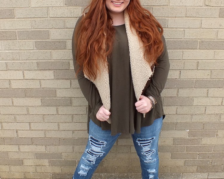 Personally, I really don’t have a specific style; if I think it is cute, I will buy it. Some days, you can find me really dressed up, while other days, I will be in a comfy, laid-back outfit. I shop anywhere and everywhere, and I live for a good sale. Being in college, I have found a new level of appreciation for online shops and am currently into Tobi. Since this semester is starting with the end of winter, I get to express my love for all kinds of fur vests, as well as the colors maroon and hunter green, but don’t worry because come spring, my vest obsession flips to a kimono obsession. For this look, I paired one of my favorite vests with a simple hunter green long-sleeve top. I topped that off with my distressed jeans–my current go-to pair–and then dressed my outfit up with some suede tan heeled booties. I love completing an outfit with some simple jewelry–most of which carry a special meaning to me–just to add a little glitz to any look. For this outfit, I threw on my Alex and Ani bracelets on to complete it.