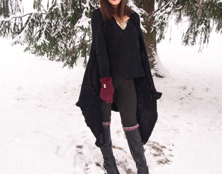 For this look, I took a basic black long sleeve T-shirt and paired it with my favorite oversize sweater vest. I went with my army green jeggings and fuzzy leg warmers to add a little bit of color to the black. With as much snow as we’ve seen in Ohio lately, I couldn’t go wrong with my black and gold soled Steve Madden zip boots. For the final touch, I decided to wear just a couple of my favorite winter accessories; my red gloves and pom pom hat. My gold bead necklace also completed the look.