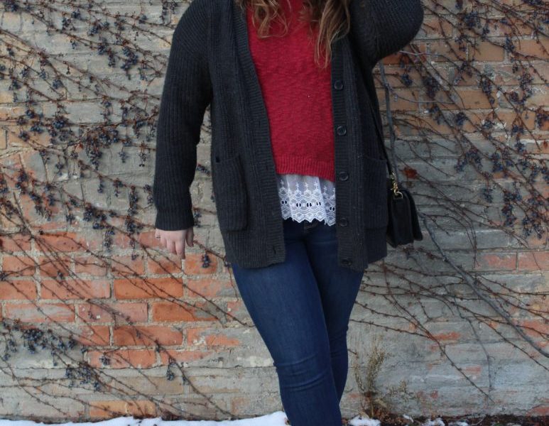To get my look I am wearing a chunky knit cardigan, a sweater detailed with lace, a small over the shoulder vegan leather bag, and lace up flats.