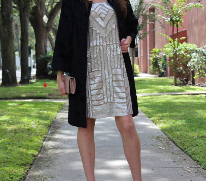 For this particular outfit, I chose a Great Gatsby/Blair Waldorf inspired look. I am wearing a sparkly gold dress—perfect for the holidays! It is paired with a black coat, beige clutch, and simple black heels to pull the outfit together. For an extra pop of color, I added a classy red lip to top off the look. Red lipstick has become a staple in my makeup bag, as I think it is the perfect accessory to make a look instantly more elegant and put together.