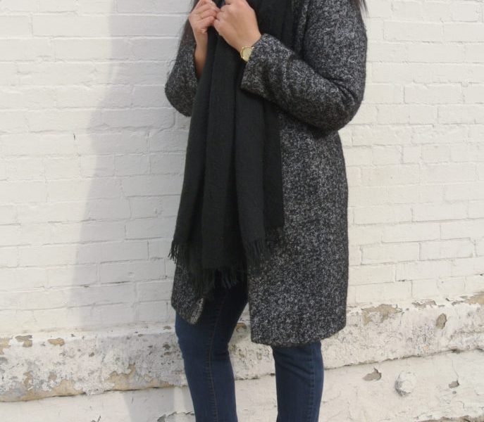For this look, I bundled up with a simple black scarf, chose a Calvin Klein coat, one of my better thrift store finds, and a pair of frayed denim that I DIY’d myself. I would say a majority of my closet has come from some sort of second-hand shop. Looking and feeling good doesn’t always have to come with a high price tag, and I pride myself in being the ultimate bargain shopper. To finish up my look, I chose a pair of block heel ankle booties (thank goodness for that trend), and I never leave the house without my Kate Spade New York watch and a dainty Madewell ring or two.